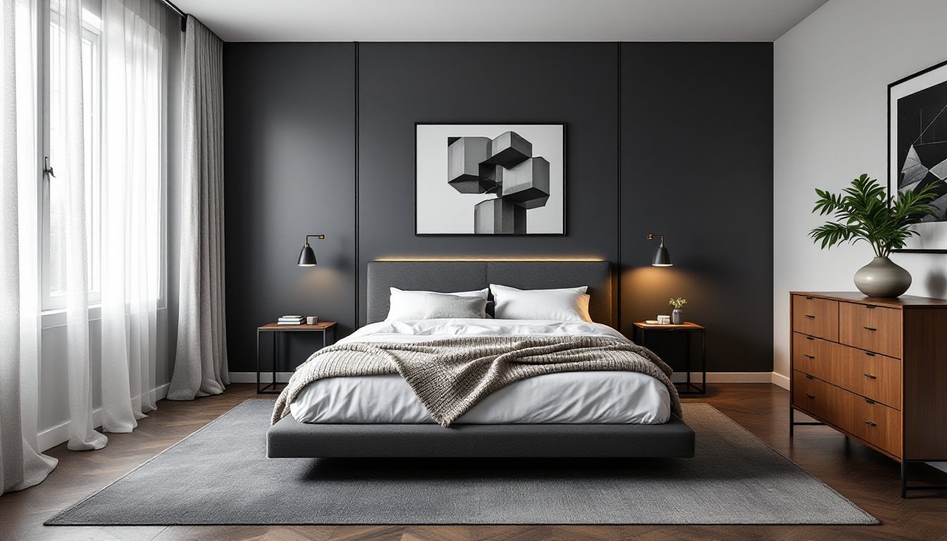 A dark bedroom doesn’t have to feel oppressive or cramped. When executed properly, a dark color scheme creates a masculine,