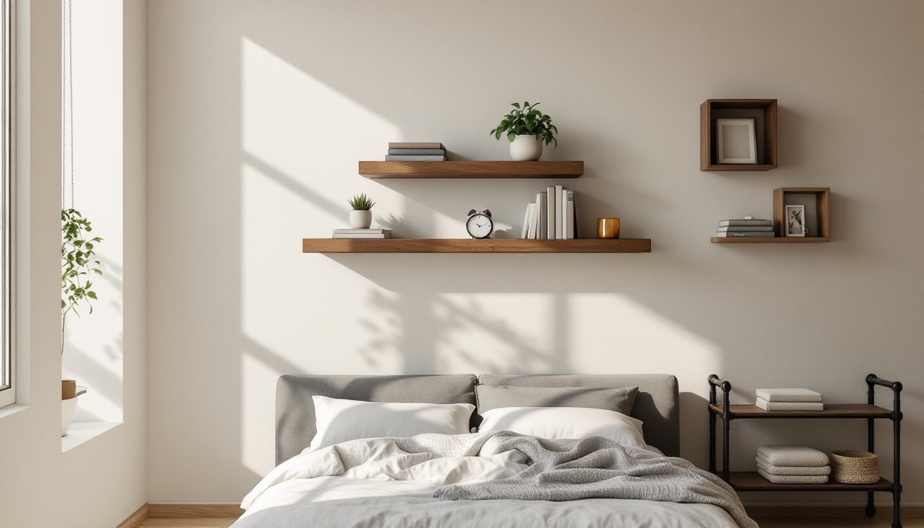 Bedroom walls often get overlooked, left blank while floor space gets cluttered with dressers and nightstands. Wall shelves flip that