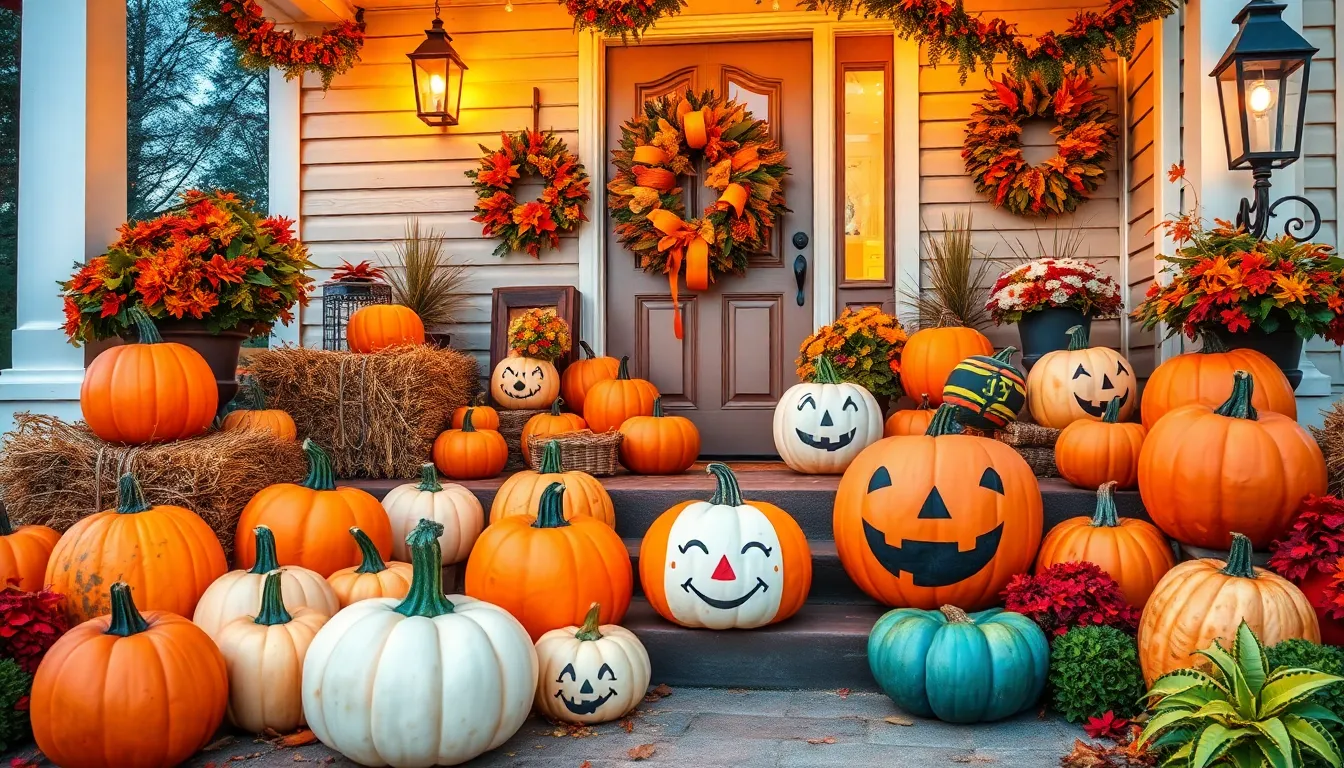 Outdoor pumpkin decorations create a vibrant autumn atmosphere and enhance curb appeal.