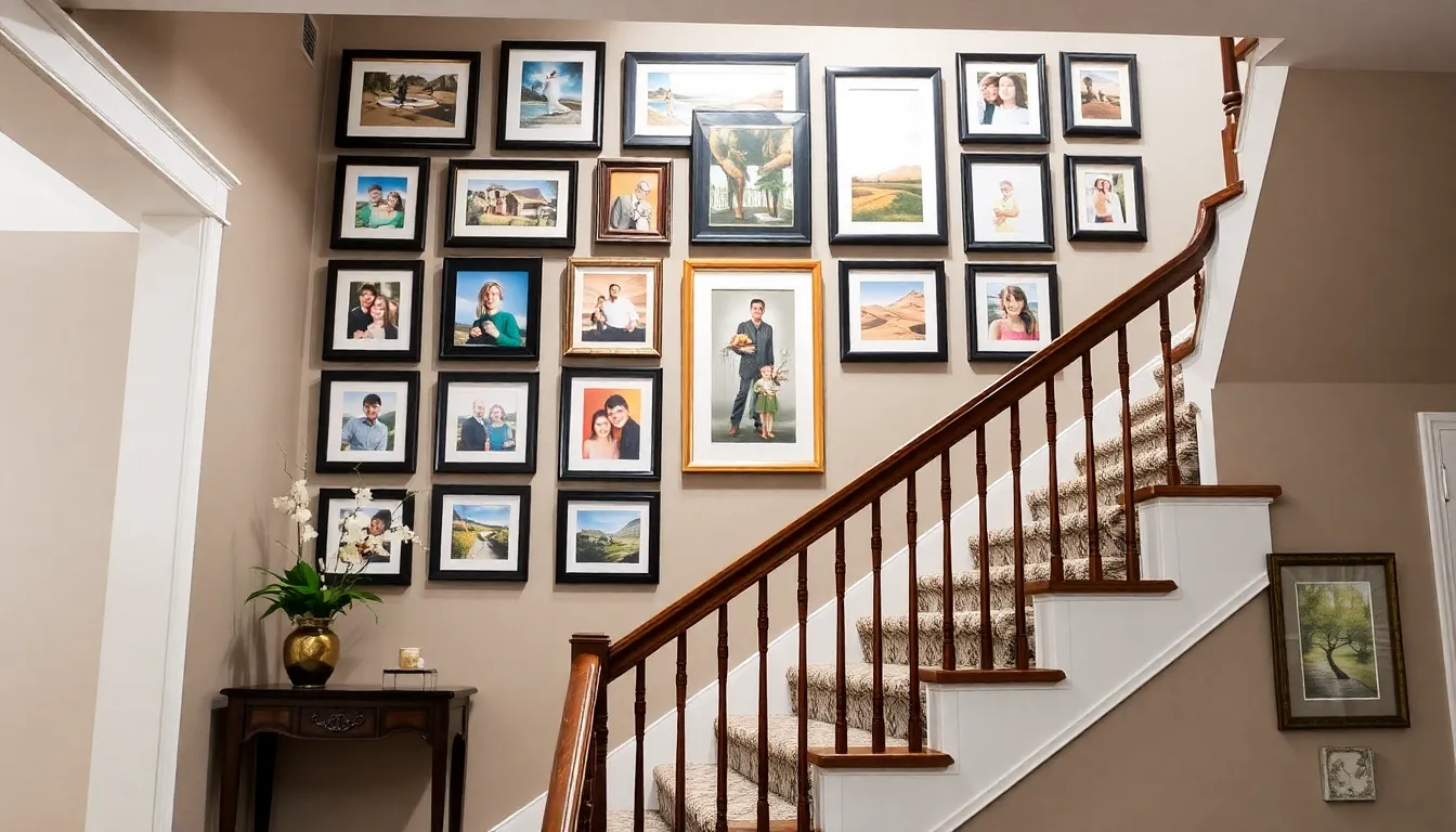 Consider a gallery wall featuring family photos in diverse frames. Mixing frame styles creates a unique aesthetic while showcasing cherished memories. Use floating shelves to display plants or decorative items. This method introduces greenery and texture to the staircase area.
